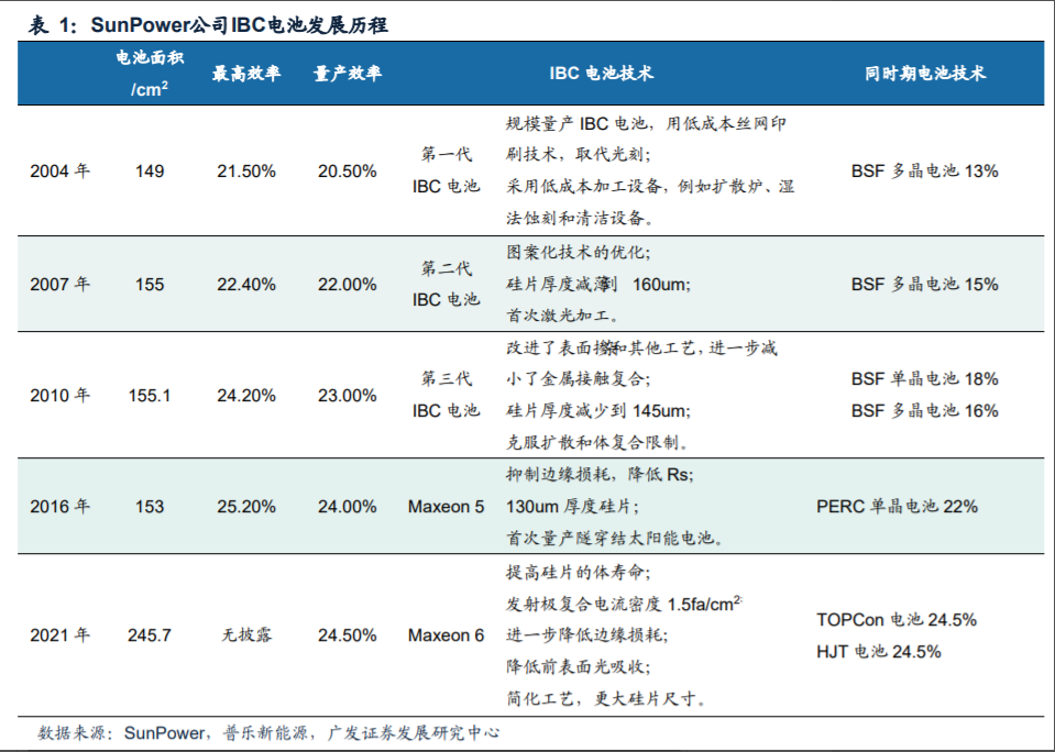 SunPower官网最新信息,其最新一代IBC电池已吸收了TOPCon电池钝化接触的技术优点,加入了隧穿氧化层(Tunnel Oxide)与多晶硅(N/P-Poly Silicon)的复合结构,并保留了铜电极工艺;从电池结构来看,量产工艺已经简化,成本在可接受范围,平均的转换效率可以达到25%,第七代电池有望将平均转换效率提高到26%的水平。