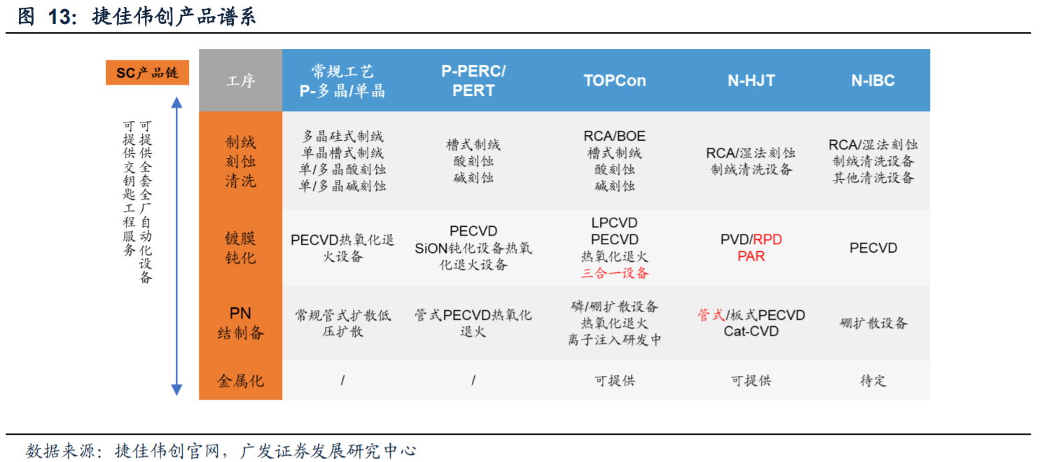 奥特维起家于组件设备,新进入硅片设备、电池片设备以及半导体设备领域,有望成为平台型企业;帝尔激光转印技术持续突破,有望贡献可观增量收入;海目星作为锂电激光设备翘楚,新切入光伏激光设备领域,已经获得一定进展;捷佳伟创实现PERC+/TOPCon/HJT设备全覆盖,TOPCon方面推出“三合一”PECVD设备,且已具备HJT整线能力;迈为股份在HJT设备方面领先明显,21年实现出口,技术实力获认可;晶盛机电作为单晶炉龙头,受益于硅片行业扩产,且有望打开碳化硅第二增长曲线。