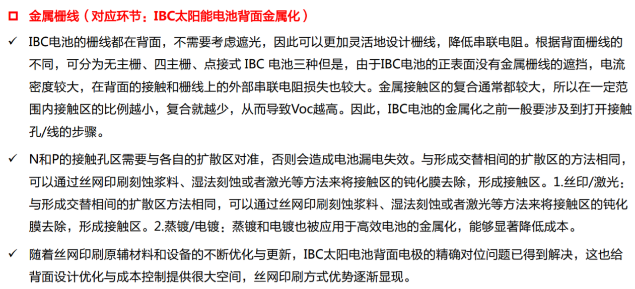 2.IBC太能能电池背面金属化。目前主流的方法:丝网印刷、铜蒸馏,其中丝网印刷优于铜蒸镀。