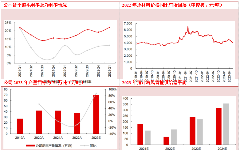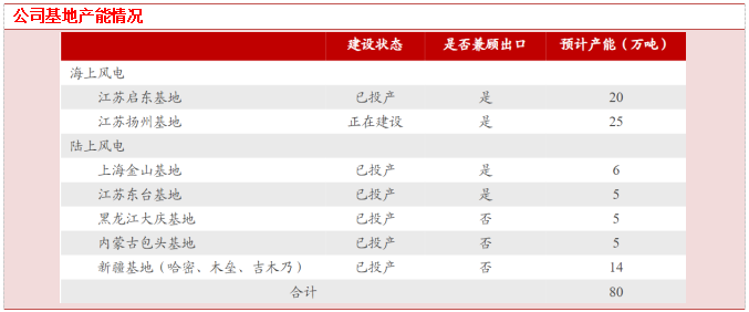 随着公司扬州基地陆续投产,投产后释放25万吨出口产能,同时江苏蓝岛产能可交付国内海风订单,出口业务、国内海风业务将实现大幅扩张;此外,公司正在启动南方海风基地的前期投资工作,预计南方基地投产后将继续扩大国内海风、出口海风业务,单吨净利具备增厚空间。
