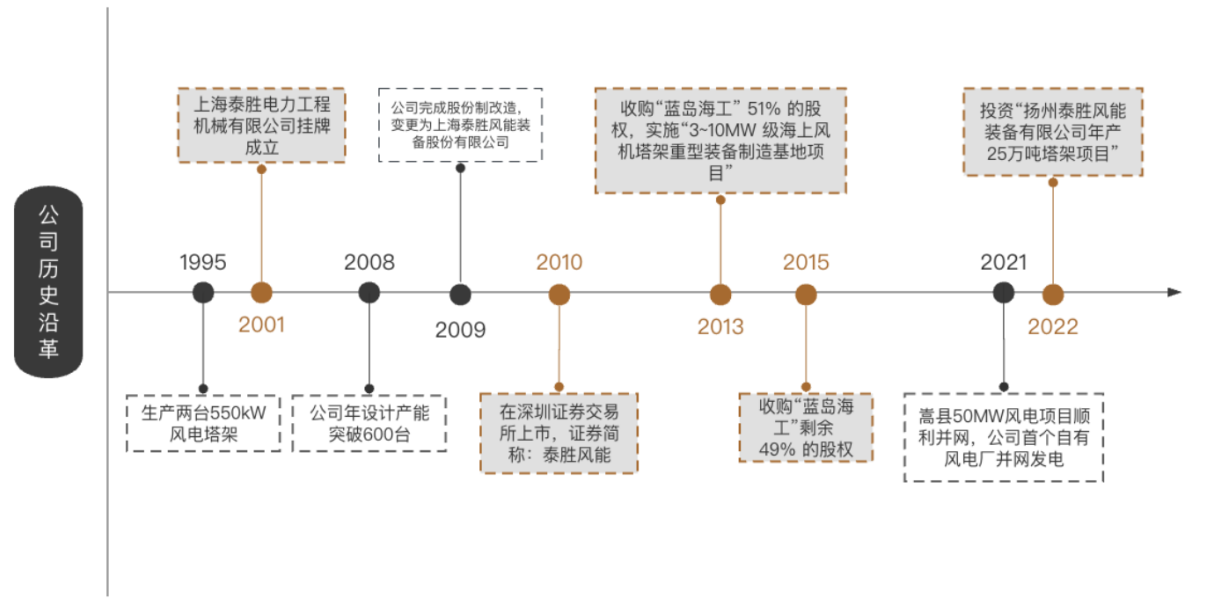 泰胜风能前身为上海泰胜电力工程机械有限公司,是中国最早专业生产风机塔架的公司之一,成立于2001年,于2010年在深交所上市。随后公司积极拓展海风业务,收购南通蓝岛海洋工程有限公司股权。