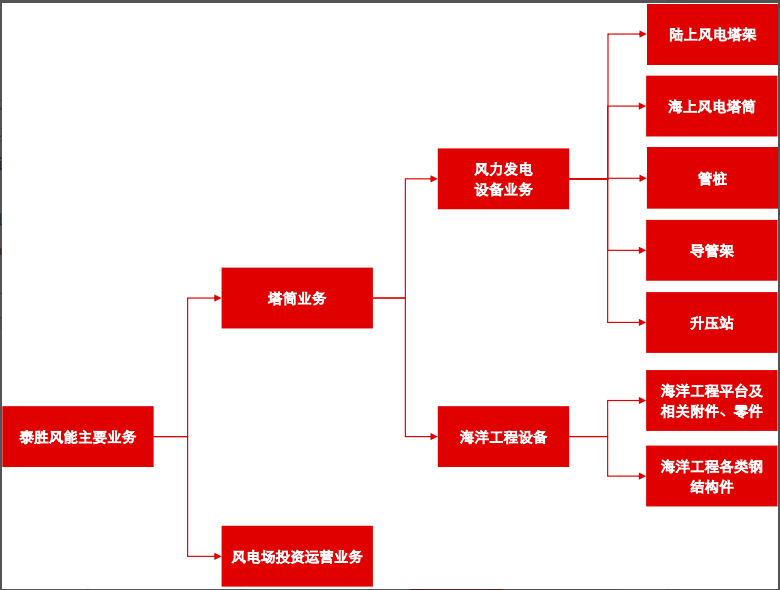 公司主营业务方面,风力发电设备业务主要产品为自主品牌的陆上风电塔架和海上风电塔筒、导管架、管桩、升压站平台及相关辅件、零件,是陆上及海上风力发电机组的主要部件之一,主要起支撑作用;海洋工程设备业务主要产品为海洋工程平台相关辅件、零件以及用于海洋工程的各类钢结构件,相关产品作用涵盖海洋工程的各个方面,视具体订单而有所不同。
