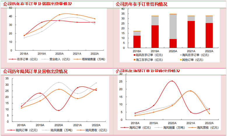 从历史规律看,公司当年的营收、塔筒出货量与上一年度在手订单的数量具有较强的相关性,即上一年度在手订单数量较多,则当年公司的营收、塔筒出货量一般也同比有所增长。