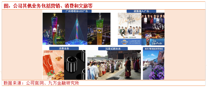 除以内容衍生的业务之外,通过与控股股东合作,公司还布局线上线下营销,消费和文旅业务。线上营销主要是剧集品牌植入,线下营销以广州塔塔身LED广告位为主。消费业务推出了意面品牌“食空π对”和香薰品牌“在调”。文旅业务主要与控股股东合作,运营“美的·鹭湖旅游度假区”,同时主办音乐节,组织实景剧本杀体验等。