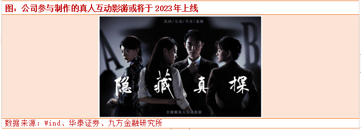 公司对影视业务进行发掘创新,与大鱼快游、哔哩哔哩合作的真人互动影游《隐藏真探》或于2023年上线B站。游戏在拍摄真人影视的基础上,增加游戏的可玩性,通过不同的选择出发不同的影视内容,使游戏更具沉浸感。目前在哔哩哔哩游戏已有近18万玩家预约。