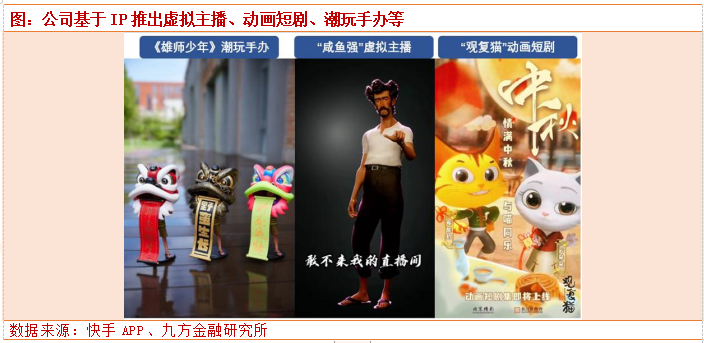 同时,从内容出发,公司深化IP运营,围绕《雄狮少年》IP推出虚拟主播和潮玩手办,新IP“观复猫”也将于近期推出。其中,虚拟主播“咸鱼强”快手粉丝接近50万,获赞近百万,已成为较成熟的虚拟主播,有开展带货的潜力。“观复猫”基于马未都观复博物馆知名IP,动画短剧有望于年内上线抖音平台,主要传播中华传统文化,有望打造成富有教育属性的IP形象。