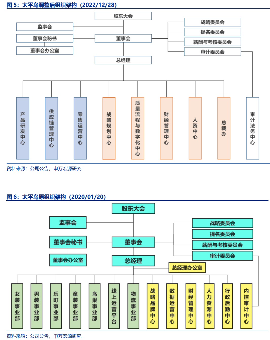 公司取消品牌事业部,转为三大职能中心,旨在提效。本次组织架构调整,相对之前最大变化在于将原有的六大独立事业部(女装、男装、乐町、童装、鸟巢、物流)+线上运营平台,转化为了三大职能中心(产品研发中心、供应链管理中心、零售运营中心)。