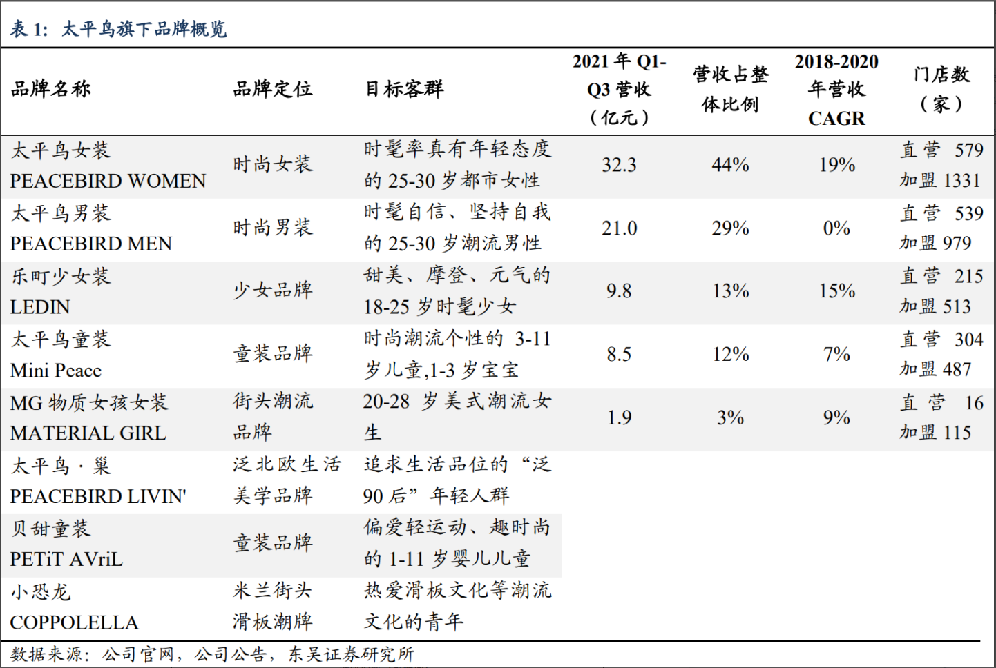 太平鸟品牌创立于1996年,聚焦青年时尚定位中档的多品牌休闲时尚服饰公司。2015年开始男女装年轻化转型,大胆转化目标客群,定位中档休闲时尚市场,拥有太平鸟女装、太平鸟男装、乐町少女装、Mini Peace 童装等多个品牌。