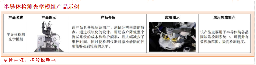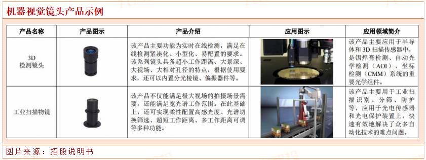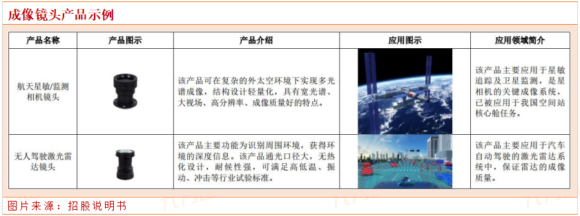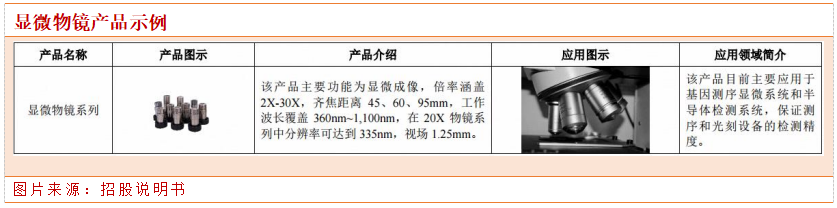 2、精密光学镜头:包括显微物镜、机器视觉镜头、成像镜头和监测镜头系列产品,具有高精度、高分辨率、成像质量优质的技术特点,可应用于半导体检测设备、基因测序显微设备和 3D 扫描、光电传感、航天监测及激光雷达等领域。公司的视觉测量相机镜头组件被成功应用于执行我国空间站核心舱任务。
