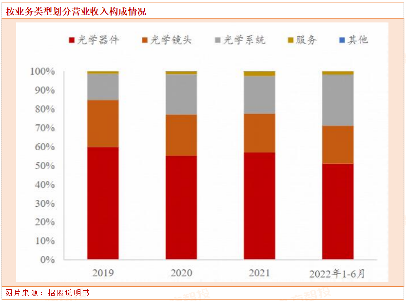 根据招股说明书,2022年上半年,公司光学器件业务为第一大业务,占比50.88%,光学镜头及光学系统业务分别占比20.3%、27%。