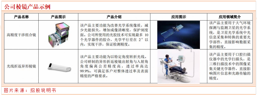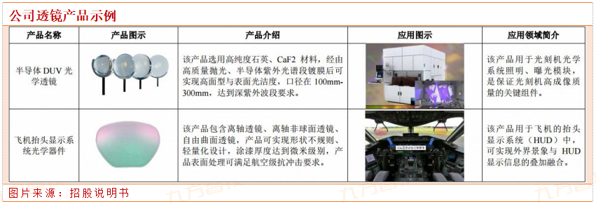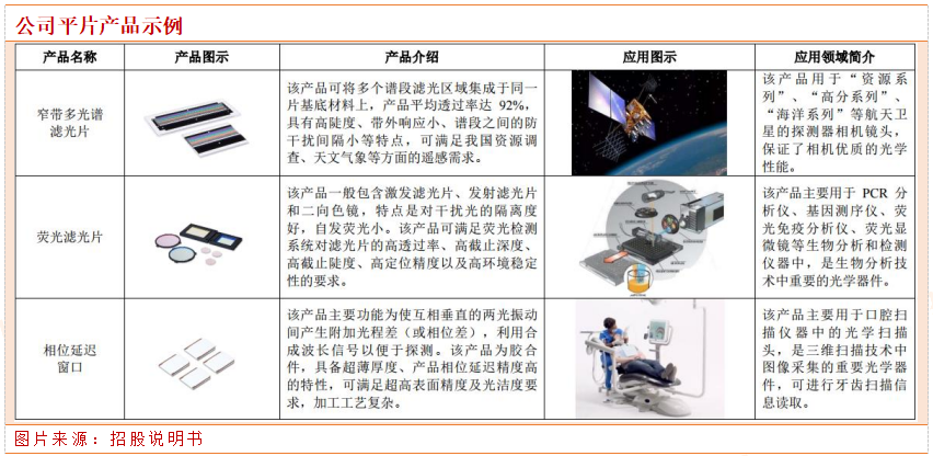 1、精密光学器件:包括透镜、棱镜和平片(包括多光谱滤光片、荧光滤光片、太空反射镜等),具有高面型、高光洁度、高性能镀膜指标特点,应用于光刻机、高分卫星、探月工程、民航飞机等国家重大战略发展领域。公司研发的精密光学器件已应用于国产光刻机中,为光刻机国产化提供了重要支撑;公司自主研发的航天用滤光片可在复杂的外太空环境下实现多光谱高清成像,已成功应用于我国“资源系列”、“高分系列”、“海洋系列”等卫星载荷项目。