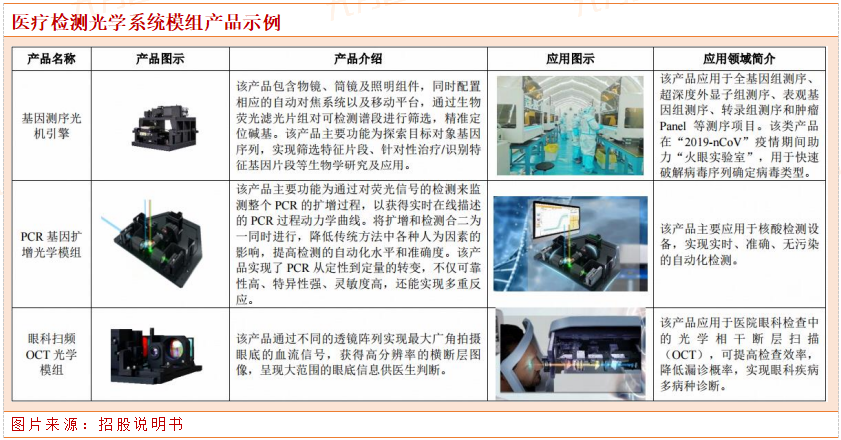 3、精密光学系统:公司光学系统主要包括医疗检测光学系统模组、半导体检测光学模组、生物识别光学模组、AR/VR 光学测试模组及光学检测设备。公司为终端客户提供光学、机械、电子、算法一体化的解决方案,从产品设计、样品交付到批量生产,提供一站式服务。