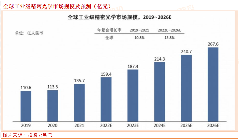 依据沙利文的预测,全球工业级精密光学市场从2019年的110.6亿人民币上升到2021年的135.7亿人民币,年均复合增长率达到10.8%。预计全球工业级精密光学市场规模将从2022年的159.4亿人民币增长到2026年的267.6亿人民币,市场将迎来加速成长,年均复合增长率约为13.8%。