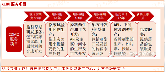 CDMO的服务内容:涵盖中间体、API(原料药)、制剂的工艺开发生产和包装服务,横跨研发的不同阶段,并且订单规模也随项目的进展呈现明显放大趋势:临床前/临床Ⅰ期(公斤级/十万美元级)临床Ⅱ期(0.1吨~3吨级/百万美元级)临床Ⅲ期(1吨~10吨级/千万元~亿元人民币级)新药申请(3吨~100吨级/亿元人民币级)新药上市后(3吨~100吨级/重磅药10亿元人民币以上)。