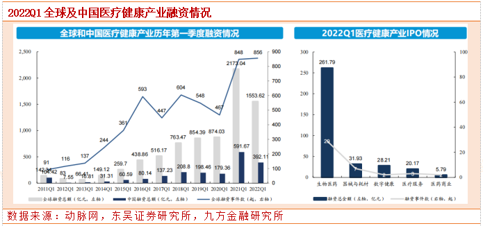 2022Q1全球和中国医疗健康产业融资总额出现回落。根据动脉网数据,2022Q1全球和中国医疗健康融资额均出现回落,分别为1553.62亿元和392.11亿元,同比下降分别为28.50%和33.73%;
