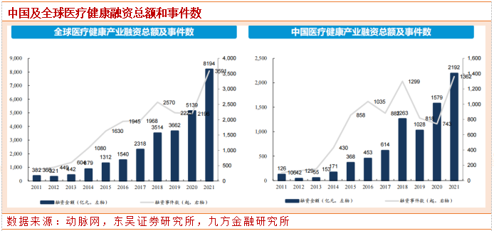 CDMO市场的需求以医疗健康产业的投资作为前提。从融资规模看,全球医疗健康产业领域投资方兴未艾,2021年全球融资总额处于历史高位。根据动脉网数据,2021年全球医疗健康融资额同比增长约70%,达8194亿元;融资事件数为3591起,同比增长64%。融资金额与融资事件数均创历史新高。