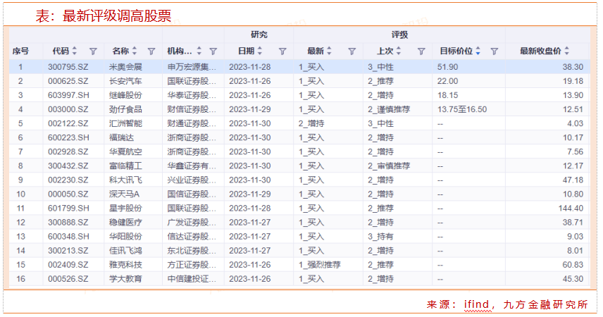 近5日有16家公司获得券商调高评级,给出目标价格仅有米奥会展、长安汽车、继峰股份以及劲仔食品。