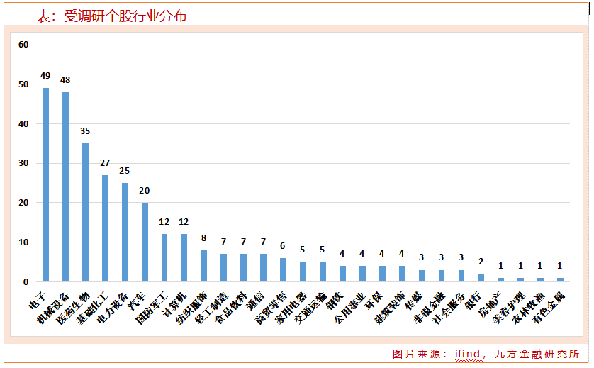 从行业分布来看,本周电子、机械设备行业分别有49、48家上市公司接受调研;随后为医药生物行业,有35家上市公司接受调研。