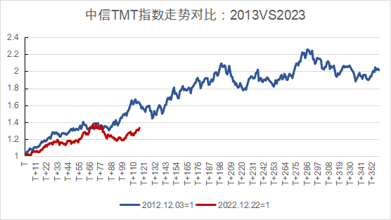 6月16日,TMT板块继续大涨,传媒、计算机、电子、通信等相关行业涨幅靠前,中信TMT指数本日上涨2.20%。不过,对比2013年走势来看,当前TMT板块可能已经接近主升浪3浪的末尾,后续可能会面临一定的调整风险。