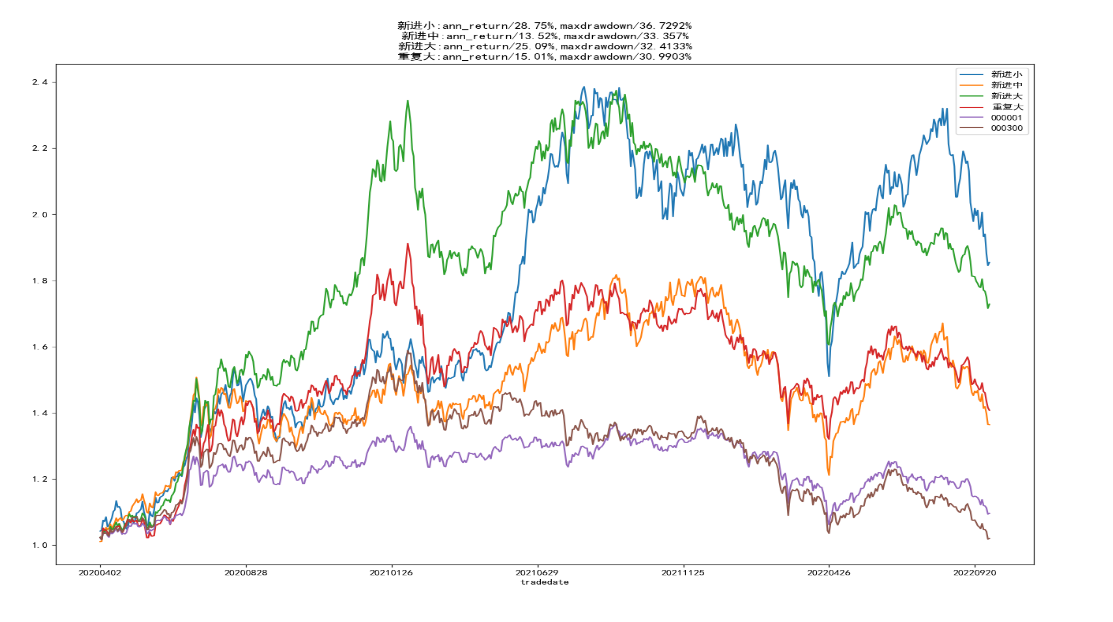 策略在模拟阶段内的收益(不代表未来收益):2020年4月至2022年10月,新进小组合净值超过1.8,重复大组合净值1.4,上证指数和沪深3000指数涨幅都低于10%,策略超额收益显著。新进小组合弹性较大,高峰时净值接近2.4,最大回撤达36.7%。