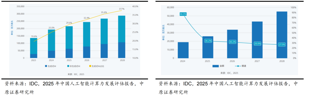图表3:2023-2028年全球生成式人工智能和非生成式人工智能服务器市场规模及预测(左)2024-2028年中国AI服务器市场规模及预测(右)