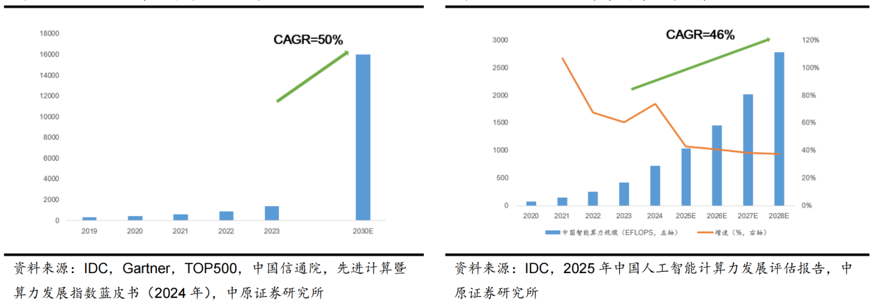 图表2:2019-2030年全球算力规模情况及预测(EFLOPS)(左)2019-2026年中国智能算力市场规模预测(右)