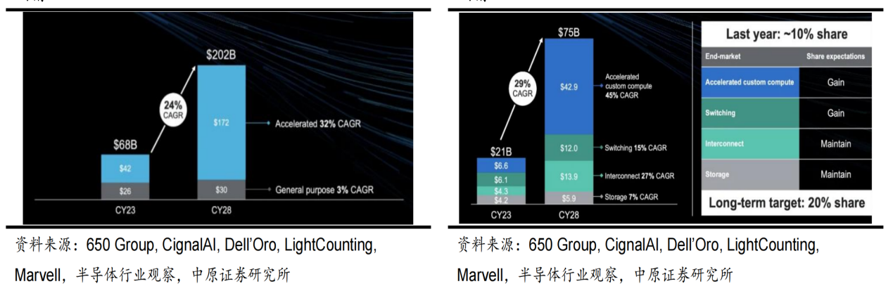 图表6:2023-2028年数据中心AI算力芯片市场规模及预测情况(左)2023-2028年数据中心定制ASIC芯片市场规模及预测情况(右)