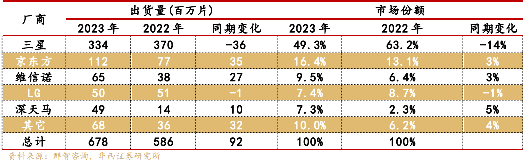 国产手机需求拉动国内 OLED 屏厂 23 年出货量快速增长