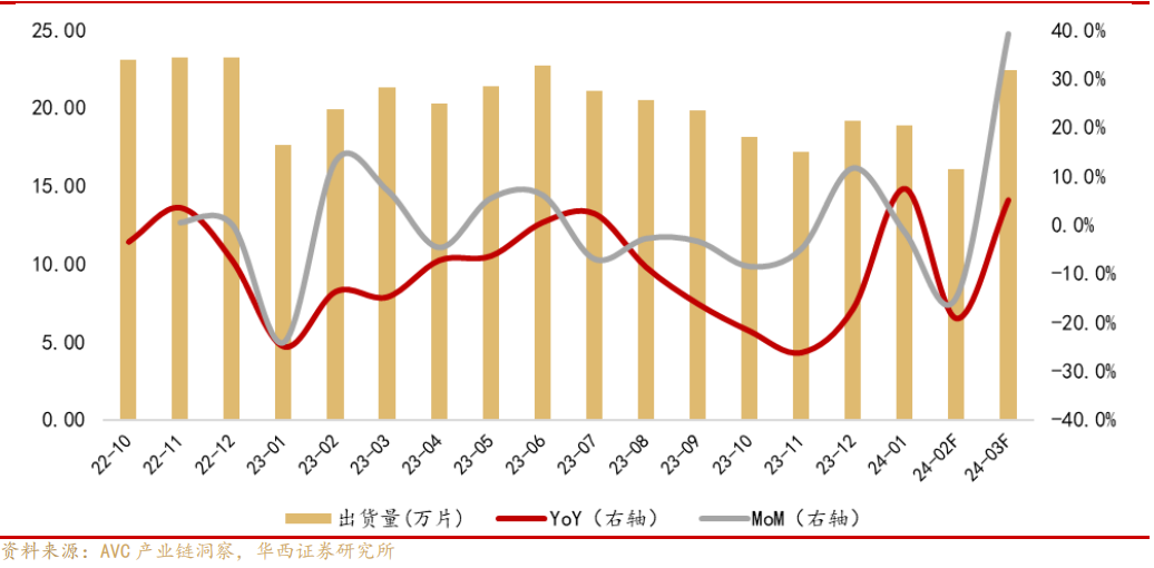 2024开年需求向好,下游采购有望连续两个季度环比增长,需求增长促使下游接受涨价。根据AVC信息,今年第一季度,TOP11整机厂采购量增加至41M,环比恢复增长,第二季度采购量将进一步提升至47M,需求恢复下,整机厂不得不接受面板厂提出来的涨价诉求,以确保其自身供应链的安全和稳定。