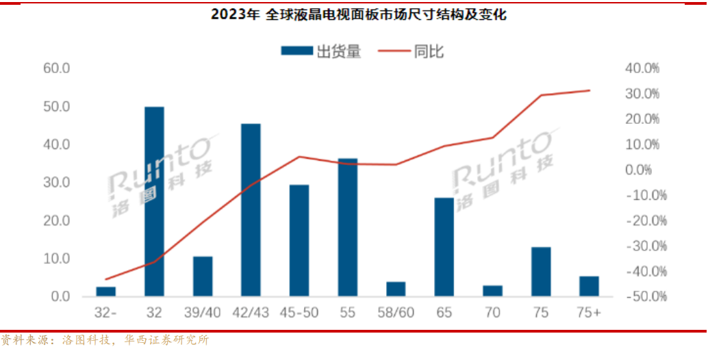 根据洛图科技的信息,32寸仍为出货量最多的尺寸,达到5000万片,但是同比下降高达36.2%,市场占比为22.2%,较2022年大幅下降8.9个百分点。2023年,缩减小尺寸,增加大尺寸的生产计划是面板厂的共识;65吋全年出货约2600万片,同比增长9.4%,市场占比达11.5%,较2022年提升2.1个百分点,在所有尺寸中占比提升最多,大陆面板三强的合并市占率达到73.5%;75寸以上出货约540万片,同比增长31.3%,涨幅第一。