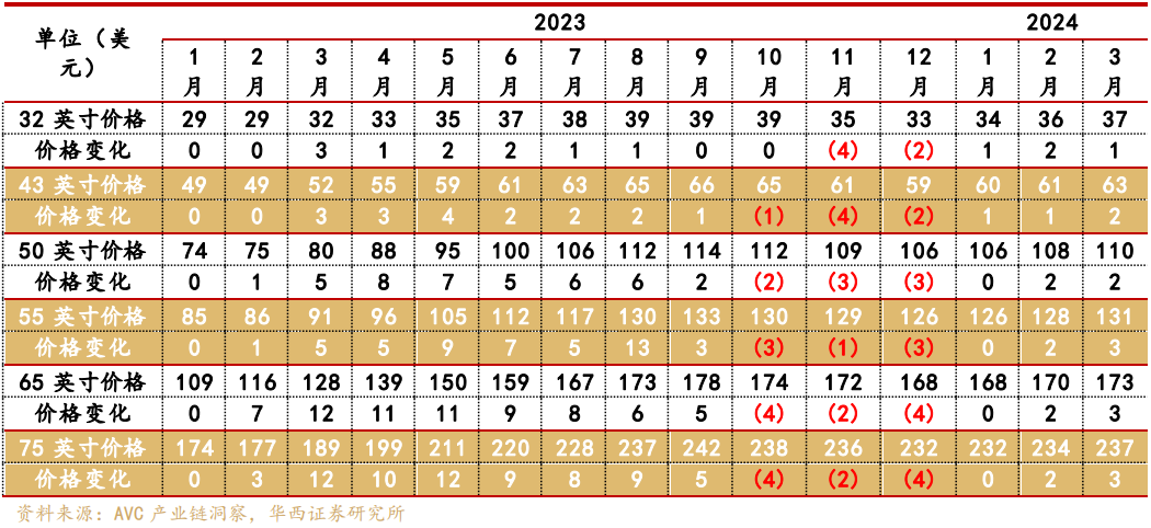 ①3月份各主流尺寸LCD TV面板价格呈现加速上涨趋势,行业或将开启上行新周期;