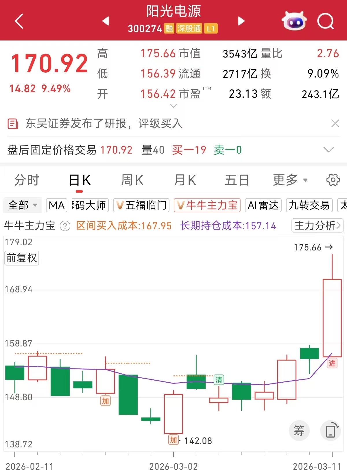 根据主力宝监控,今日大涨的存储龙头阳光电源,在3月11日出现主力进场信号,感兴趣的朋友可以自行跟踪判断。