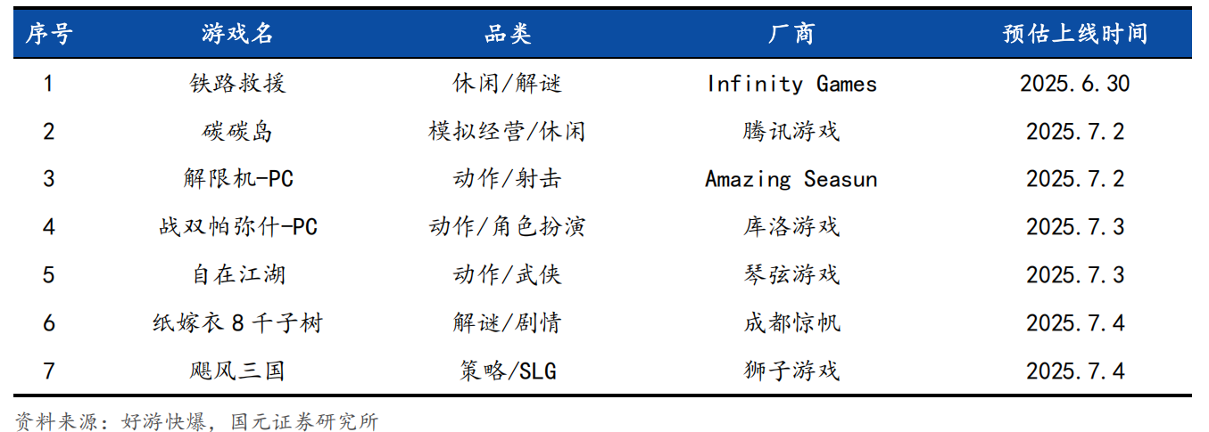 B)后续新游上线方面,2025.6.28-2025.7.4期间有7款游戏将上线,腾讯旗下模拟经营游戏《碳碳岛》于7.2上线,库洛游戏旗下《战双帕弥什-PC》将于7.3上线。