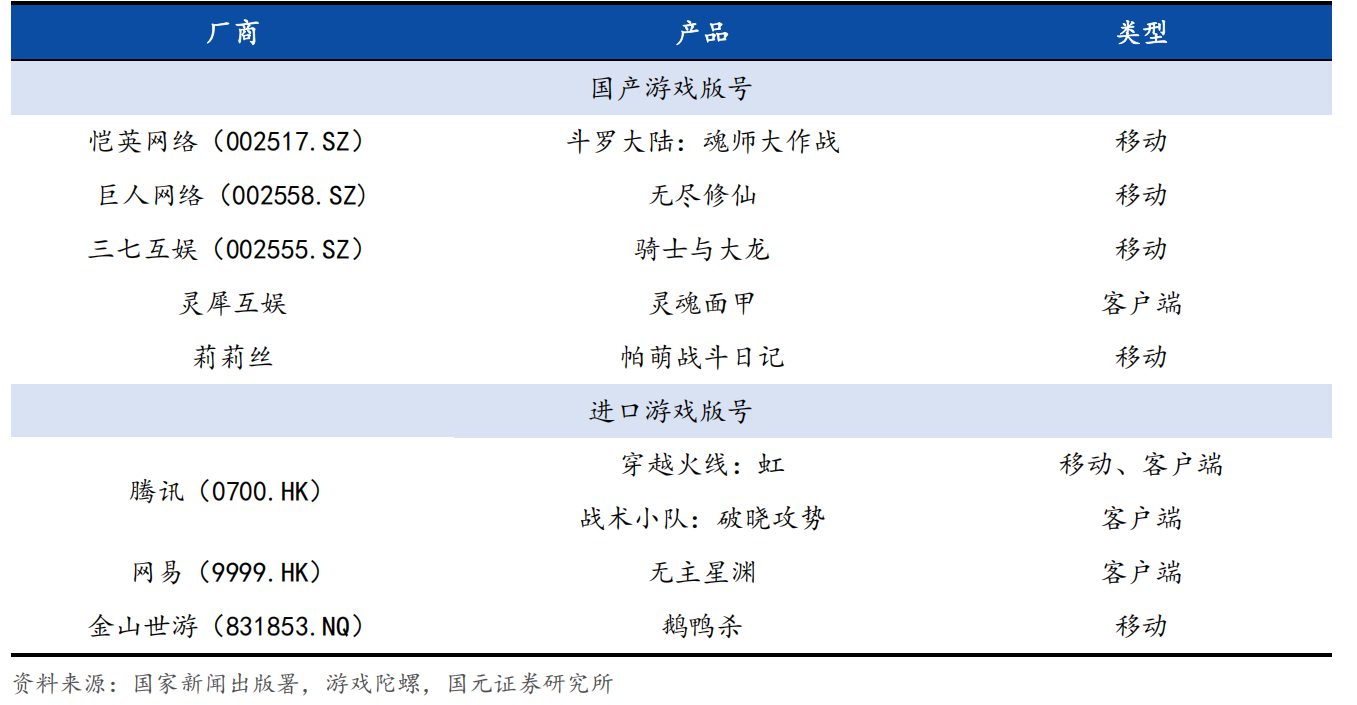 多款上市游戏厂商的储备产品获批,国产版号方面,恺英网络IP储备产品《斗罗大陆:魂师大作战》、巨人网络《无尽修仙》、三七互娱《骑士与大龙》、灵犀互娱《灵魂面甲》、莉莉丝《帕萌战斗日记》获批;进口游戏版号方面,腾讯《穿越火线:虹》《战术小队:破晓攻势》、网易《无主星渊》、金山世游《鹅鸭杀》获批。