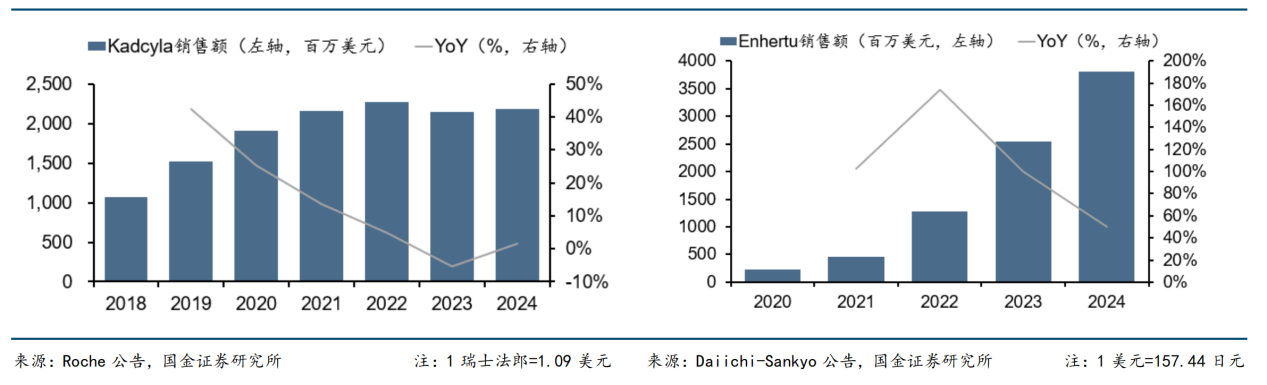 图表1:T-DM1于2024年销售额保持20亿美元以(左)T-DXd于2024年销售额快速攀升(右)