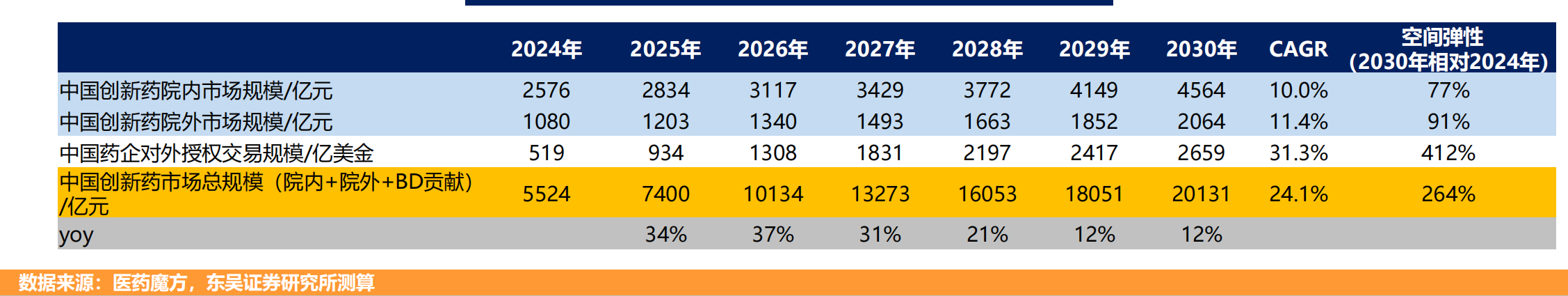 A)测算2024年中国创新药市场规模(院内销售+院外销售+BD首付款和里程碑)近5500亿人民币,2025-2027年依靠BD收入迎来爆发,我们预计2030年中国创新药市场规模(院内销售+院外销售+BD首付款和里程碑+销售分成)将突破20000亿人民币,CAGR=24.1%,相比2024年,市场规模增长近264%。