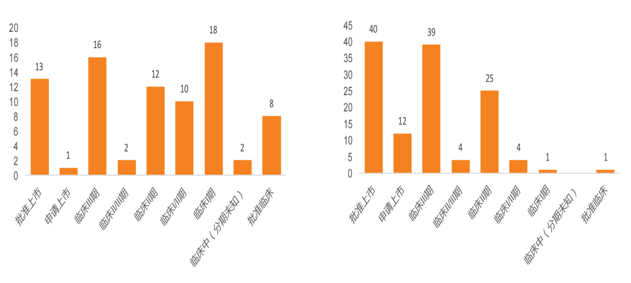 图表4:取得CDE突破性疗法认证的国产创新药(自研)在海外的临床进度(左)取得CDE突破性疗法认证的国产创新药(自研)在国内的临床进度(右)