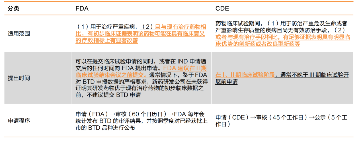 A)为鼓励研究和创制具有明显临床优势的药物,中国和美国都出台了加速药物审批上市的政策“突破性疗法认定”(BTD)。 FDA的突破性疗法认定程序早于2012年已经设立,而NMPA在2020年才开始试行。不管是在中国还是美国,想要纳入BTD, 必须满足以下2个条件: