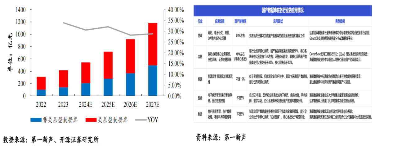 图表4:2022-2027年中国数据库市场复合增长率预计达到30.67%(左)在八大关基行业,数据库替换正从非核心、次核心系统向核心系统突破(右)