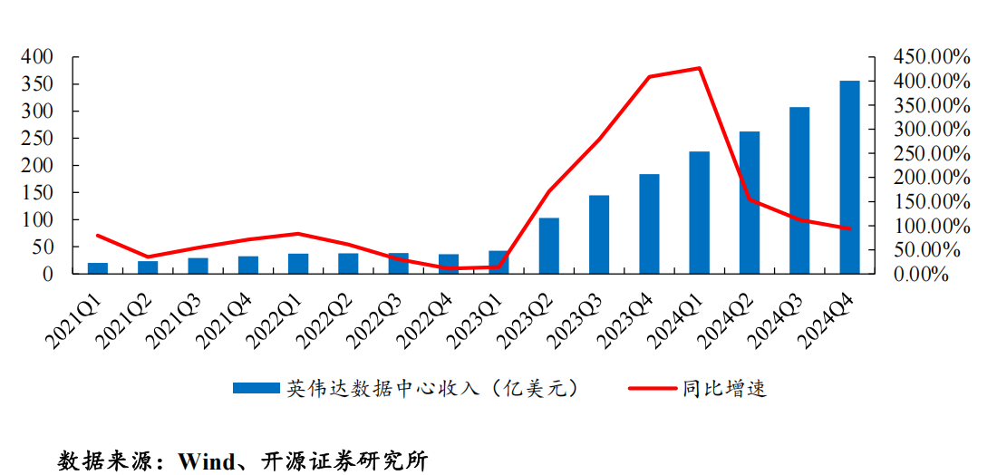 B)算力端:大模型的快速发展,带动了AI算力的强劲需求。Microsoft 、Google 、AWS、Meta四大云服务厂商资本开支持续强劲,说明AI算力需求旺盛。根据各大云厂商最新披露的财报: 2024Q4,Microsoft资本开支为158.04亿美元,同比增长62.34%;Google资本开支为142.76亿美元,同比增长29.56%;AWS资本开支为260.52亿美元,同比增长95.10%;Meta资本开支为425亿美元 ,同比增长88.19%。英伟达数据中心业务持续高增长,论证了AI算力的旺盛需求。