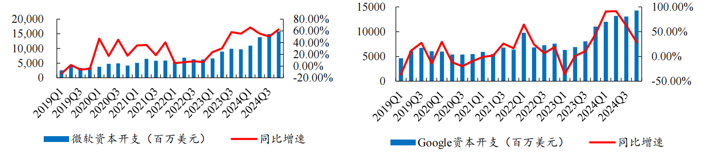 图表1:2023年以来微软资本开支高速增长(左)2023年以来谷歌资本开支高速增长(右)