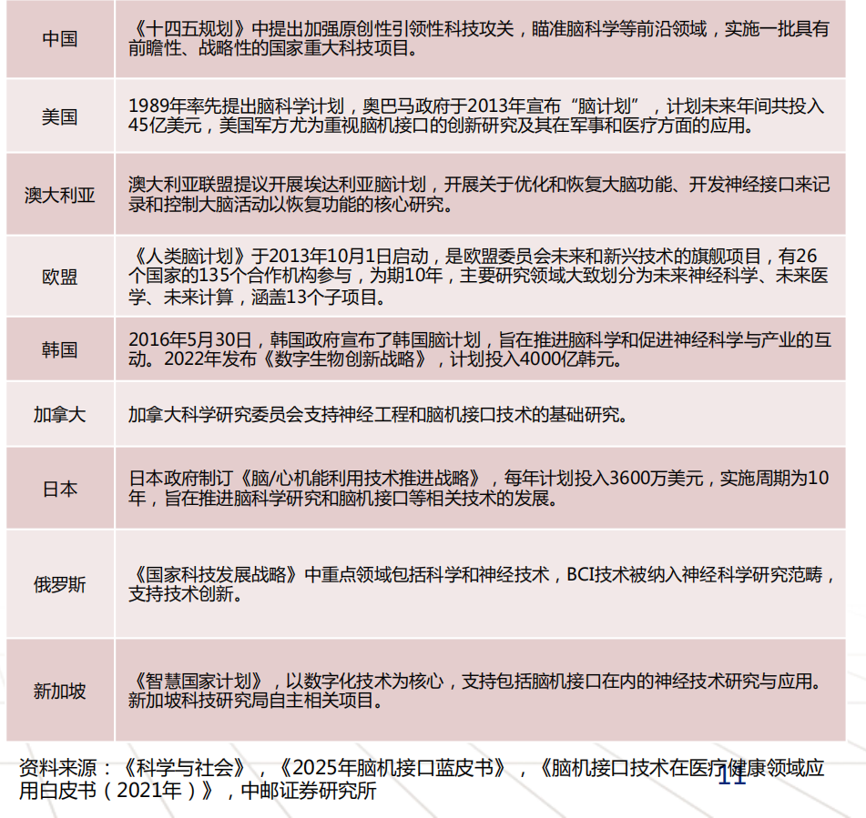 近年来,美国、欧盟、日本、韩国、以色列等国家和地区大力开展脑机接口发展规划布局,推出了针对该技术的许多重大研发计划及典型项目投资,脑机接口技术得到快速发展。我国政府陆续发文为脑机接口指引发展方向,重视脑科学发展并上升为国家战略,十四五规划明确将脑机接口列为未来产业重点攻关方向。