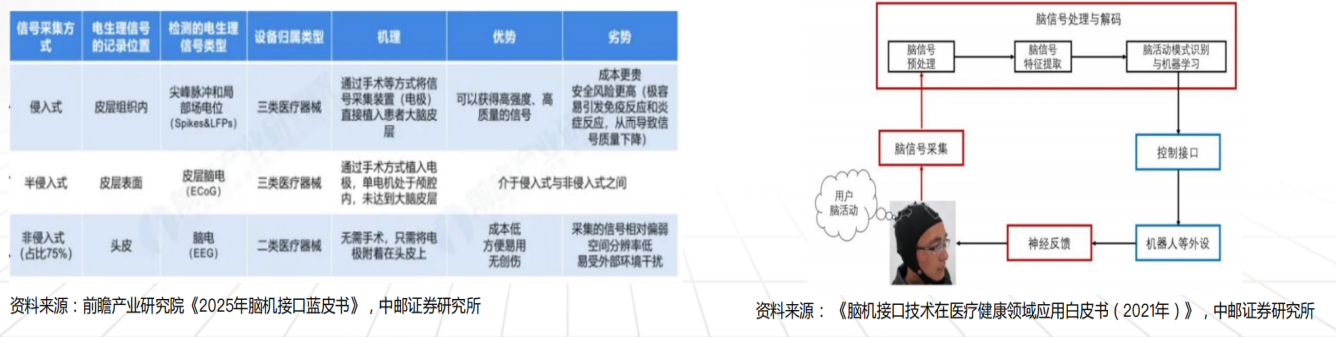 图表1:脑机接口按照信号采集方式分类(左)BCI系统示意图(右)