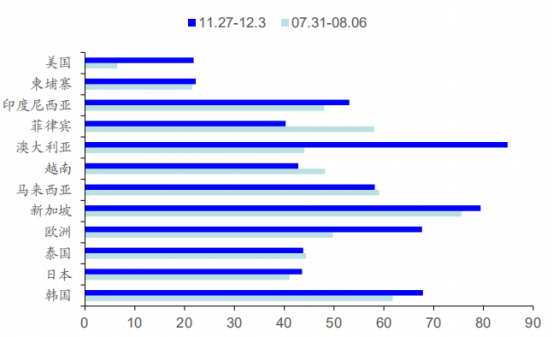 中国至主要国家出港航班量恢复进展