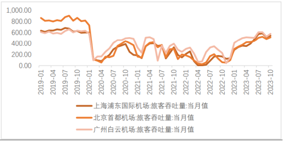 2023年 8、9、10 月上海浦东机场旅客吞吐量分别恢复到2019年同期的 87.16%、84.00%和 86.49%;北京首都机场旅客吞吐量分别恢复到2019年同期的 57.93%、59.37%和59.48%;广州白云机场旅客吞吐量分别恢复到2019年同期的 92.11%、87.40%和 90.94%。
