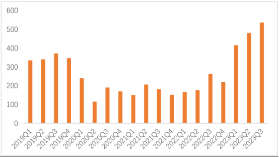 携程 2019Q1-2023Q3 机票预定业务当季值(万元)