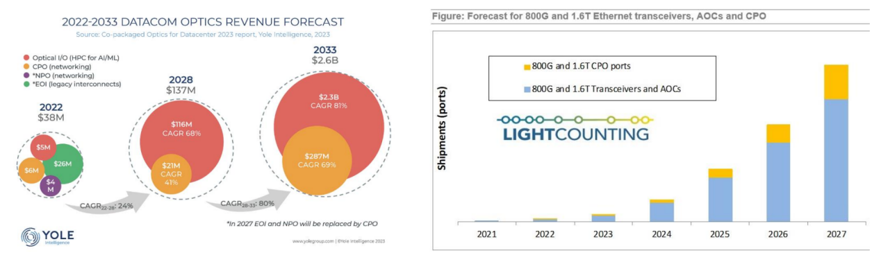 图表4:CPO/OIO市场空间广阔(左) LightCounting对CPO的预测(右)