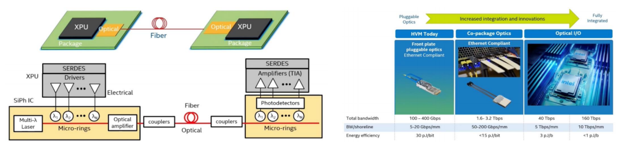 图表3:光I/O用于芯片间的互联(左) 光 I/O带宽密度提升、能效降低(右)