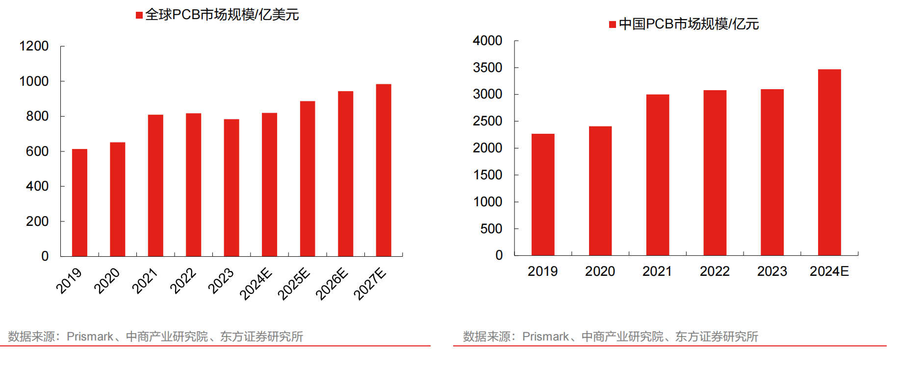 图表4:2019-2027年全球PCB市场规模(左)2019-2024年中国PCB市场规模(右)