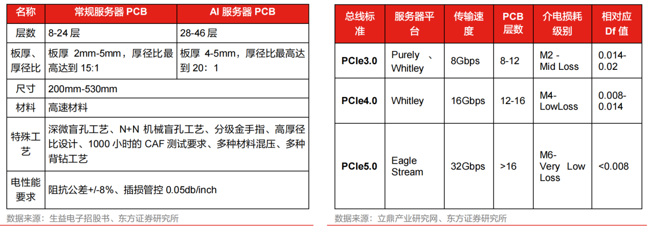 图表3:服务器PCB主要性能指标(左)服务器升级要求PCB板层数及介质损耗因子标准(右)